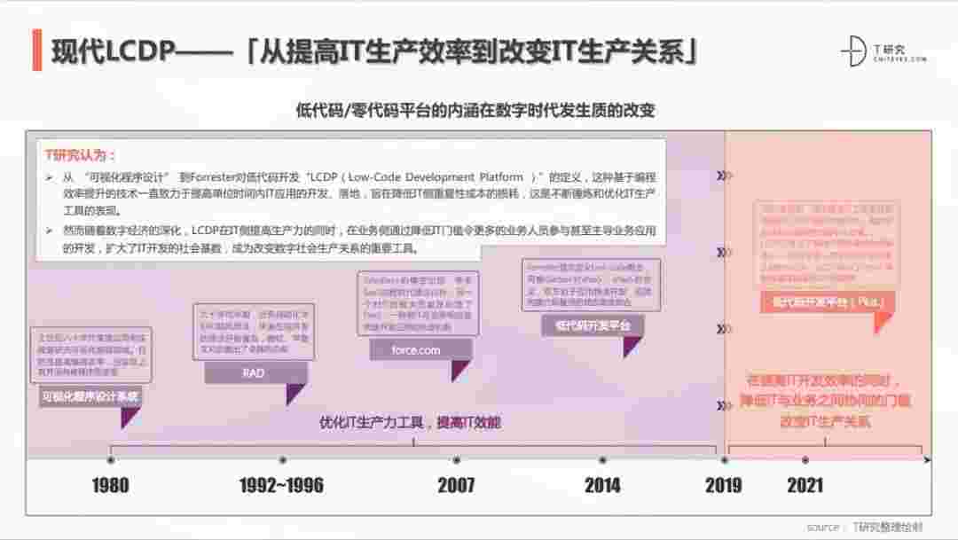 2020年前后,,,源于提高IT工作者开发效能的LCDP不断进化和衍生,,,面对业务导向日益明显的数字化变革。。。LCDP衍生出了面向不同对象的升级服务——面向专业人群的LCDP和业务人群的NCDP,,,,LCDP与NCDP的不同服务属性被逐渐认可和接受。。。。 LCDP在提高IT开发效率的同时,,,,降低IT与业务之间协同的门槛改变IT生产关系。。。。